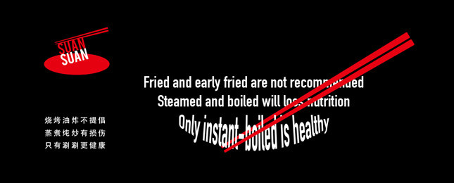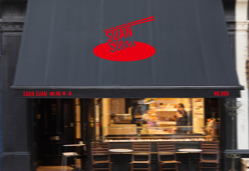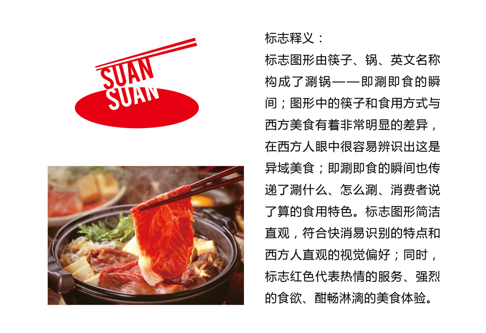 筷子捞起来的两个拼音单词“suansuan”既突出了母公司“算一算国际餐饮”的名称,及餐饮店的“好食材、好味道、开心价”的品牌定位和核心卖点,又有“涮涮”的谐音,暗含“涮锅”这种在海外市场正广受欢迎餐饮形式的主体。