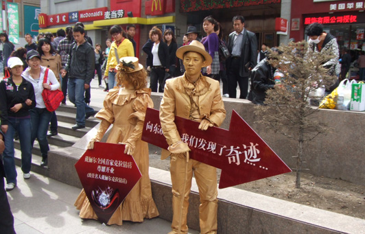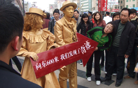 邀请北京知名人体艺术表演团队来呼市做铜人活人体雕塑表演,为了大家能够将目光聚焦戴俪尔克拉钻旗舰店,分别在戴俪尔的东南西北四个方位的繁华商业区布置铜人表演,将大家惊异的目光和好奇心指向奇迹的发生地——波士名人戴俪尔克拉钻店。